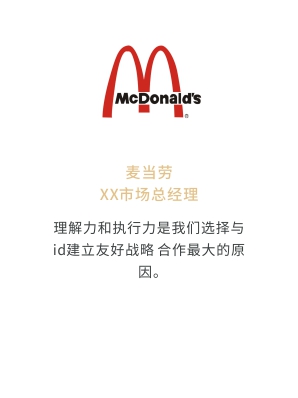 i-d先后經歷與Audi、Mercedes-Benz、infiniti、PORSCHE、可口可樂、麥當勞、肯德基、Budweiser、華為、小米、中國移動、ELLE、L'OREAL、萬達、仁恒置地、恒大、碧桂園、蘭桂坊...的業(yè)務合作,成功地將國際化的營銷策劃理念及執(zhí)行方式融入本土,為更多的中國企業(yè)開啟全新的品牌推廣思路和執(zhí)行方案。